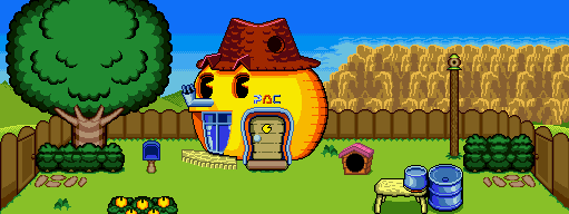 The game starts with a short, meaningless intro. After that, a small cutscene details the first objective. The first screen shows Pac-Man walking out of his own house (shaped like Pac-Man.) And then… he automatically walks to the right. Weird.. the controls don’t seem to work and the D-pad isn’t responding? Why is he not listening? Well – Pac-Man is a passive character in this game, in fact. He is only remotely controlled by giving commands of where to look. You can direct him ‘Left’ or ‘Right’, ‘Up’ or ‘Down’, indicated by a voice and on-screen cartoon bubble saying “Look!“. Pac-Man then goes: “Huh?” – and looks towards the direction you’re pointing, prompting him to move in said direction. But he won’t always listen. Depending on his mood, he will do whatever he wants.