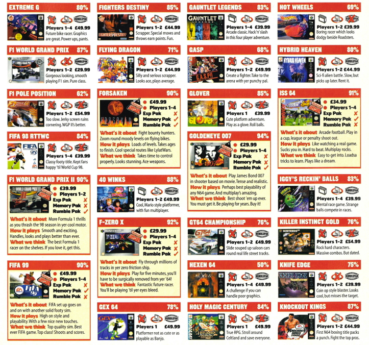 Since I didn’t have internet at home in the 90’s, I’d get my video game news from magazines. I was subscribed to Power Unlimited (because they cancelled Club Nintendo Extra, my very first magazine), but my favorite one was Nintendo Official Magazine (NOM), imported from the UK, and sold at my local cigar shop. Every time I walked past the shop I’d pop in to check if the latest issue had arrived. It was worth every cent. The previews, reviews and layout were packed with screenshots and detailed coverage. Thanks to NOM, I got hyped for games. One of the best parts was a section in the middle listing every N64 game from A to Z. These were mini reviews in little squares with a score included. Within those few pages you had an overview of the entire N64 library.