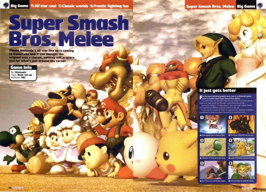 Cube launch day was hilarious. My friends, me, and some random kids were waiting at the escalator down MediaMarkt for the doors to open. There were two guys from a website called Cubezone interviewing people on the street. They asked some stupid questions, and we were taking jabs at them for the time after. Miyamoto being my second father and all that. Once the doors opened, everyone ran upstairs and to the back of the store where the Cubes were situated. A friend of mine blocked the escalator for the others kids so we had free reign to run towards the consoles and at some point I saw another friend walking with 2 Gamecube boxes, one in each hand, even though we already had one. It was like a slap-stick comedy. Once we got home and popped in Rogue Squadron, our jaws dropped to the floor. The graphics were mind-blowing. I know I use the term “mind-blowing” a lot, but the graphical leaps that video games made back then can’t be overstated to this day. The high quality textures, the silky-smooth 60 fps, the damaged paint on the X-wings, the highly detailed sky-boxes — holy shit! Had we ever seen such amazing graphics before, on any device? I don’t think so. The graphical leap from N64 to Gamecube was unreal, just as SNES to N64 was. Again, I didn’t have the money to get one, and Super Smash Bros Melee was already out and I was annoyed I couldn’t get one yet. Luckily, my friend that got a Cube offered me to borrow money so that I could buy one and pay him back later, which I accepted, and I bought the GameCube with Melee. It turned out to be everything I hoped for – and more.